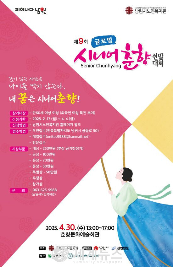[세계뉴스 = 이정열 기자] 춘향의 본고장 전북특별자치도 남원시에서 「제9회 글로벌 시니어춘향 선발대회」가 오는 4월 30일 춘향문화예술회관 대공연장에서 열린다.