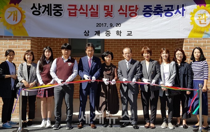 ▲ 서울시의회 환경수자원위원회 김광수 의원(왼쪽5번째, 국민의당, 노원 5)은 지난 9월 20일 상계중학교에서 열린 ‘상계중학교 급식실 및 식당증축공사 개관식’에 참석해 학교 관계자들과 학생 등이 컷팅을 하고 있다. 급식실은 지상 2층에 면적 901.30㎡로 신축됐다. © 세계뉴스 |