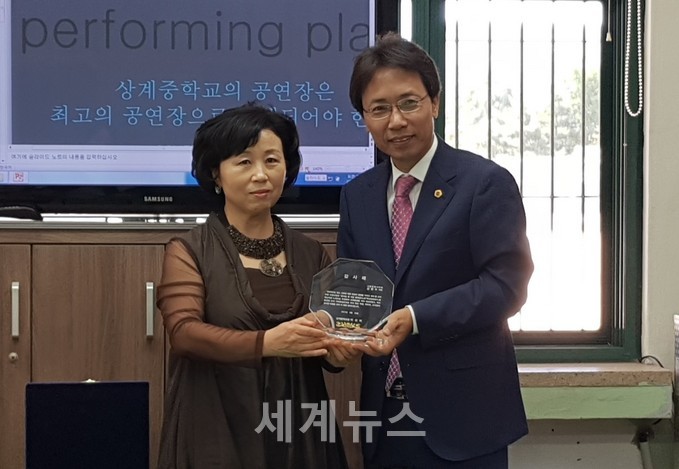 ▲ 서울시의회 환경수자원위원회 김광수 의원(국민의당, 노원 5)은 지난 9월 20일 상계중학교에서 열린 ‘상계중학교 급식실 및 식당증축공사 개관식’에 참석해 이신미 교장(왼쪽)으로부터 감사패를 수여받고 있다. © 세계뉴스 |