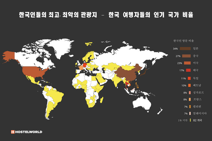▲ 호스텔월드 미트 더 월드보고서의 한국 성인이 가장 많이 방문한 국가 탑 10 © 세계뉴스 |