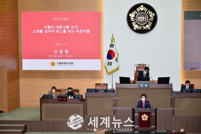 [세계뉴스 윤소라 기자] 서울시의회 주택공간위원회 신동원 시의원(국민의힘, 노원구 제1선거구)은 15일 제315회 정례회 제2차 본회의 5분 자유발언을 통해 녹천역두산위브아파트 주민들의 대중교통 이용권 보장을 위한 버스노선 신설 및 조정을 주문했다.