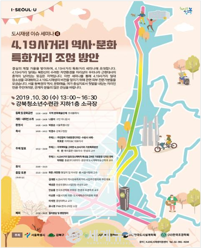 [세계뉴스 조홍식 기자] 서울시는 ‘4.19사거리 특화거리 조성 세미나’를 30일 오후 2시부터 강북청소년수련관에서 개최한다. 이번 세미나는 4.19 도시재생사업의 첫 주자인 역사문화 특화거리 조성과 주거지 골목길 활성화 사업의 효율적 추진 방안을 주제로 이루어진다.