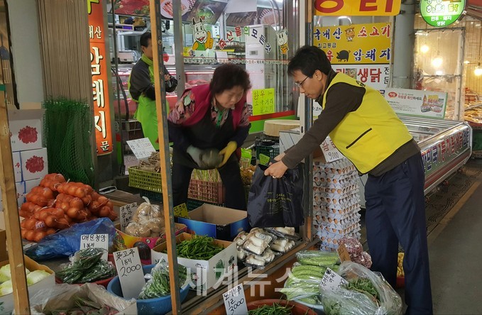 임종석 상인회장은 휴대용 장바구니를 준비해 시장손님들의 불편을 덜어줬다.