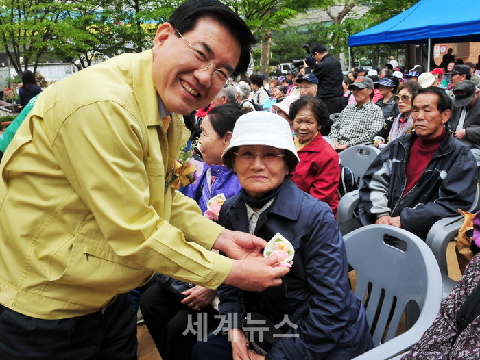 ▲ 29일 제43회 어버이날을 앞두고 유덕열 동대문구청장(왼쪽)이 저소득 홀몸 어르신들에게 카네이션을 달아주며 환하게 웃고 있다. © 세계뉴스 |