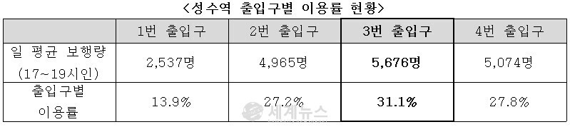 이번 조치는 출입구 이용률이 높은 성수역의 혼잡을 해소하기 위한 것으로, 3번 출입구는 퇴근시간대에 31.1%의 높은 이용률을 기록하고 있다.