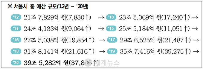 [세계뉴스 차성민 기자] 서울시가 2020년 예산(안)을 39조 5,282억 원으로 편성, 11월 1일 서울시의회에 제출한다. 유례가 없고 어느 지자체도 시도하지 않은 역대 최대 규모의 확대재정을 단행해 절박한 시민 삶의 문제를 적기에 해결하고 공정한 출발선을 지원한다. 과감한 사람투자 확대로 위축국면의 서울경제를 확실히 순환시켜 활력경제로 전환한다는 취지다.