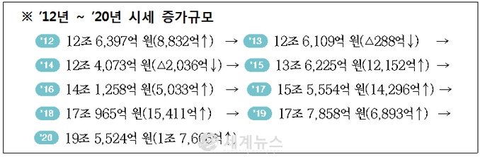 시세는 올해의 시세 징수전망액 등을 감안하고, 임금상승에 따른 소비지출 증가와, 정부의 지방분권에 따른 세율 인상 등을 감안하여 1조 7,666억 원 증가한 19조 5,524억 원으로 추계했다.