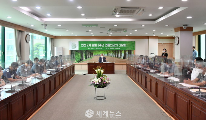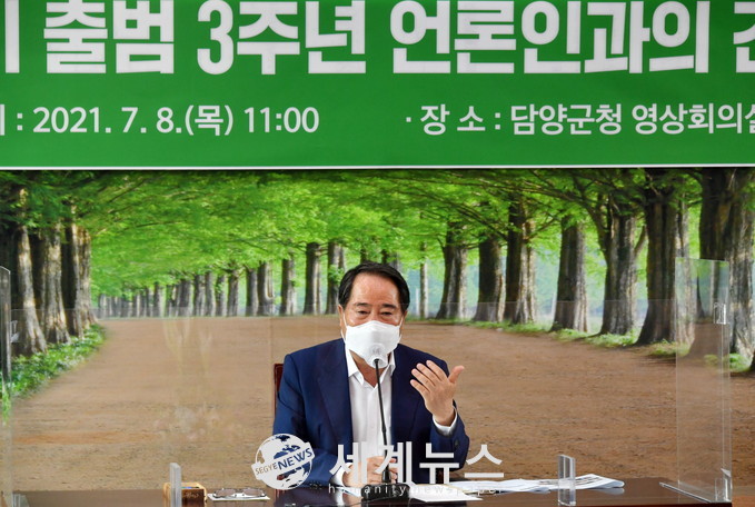 [세계뉴스 양경희 기자] 최형식 담양군수가 8일 오전 11시 군청 영상회의실에서 출입기자와의 간담회를 개최해 민선 7기 3주년 성과와 향후 군정 방향을 밝혔다.