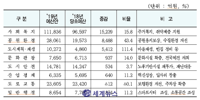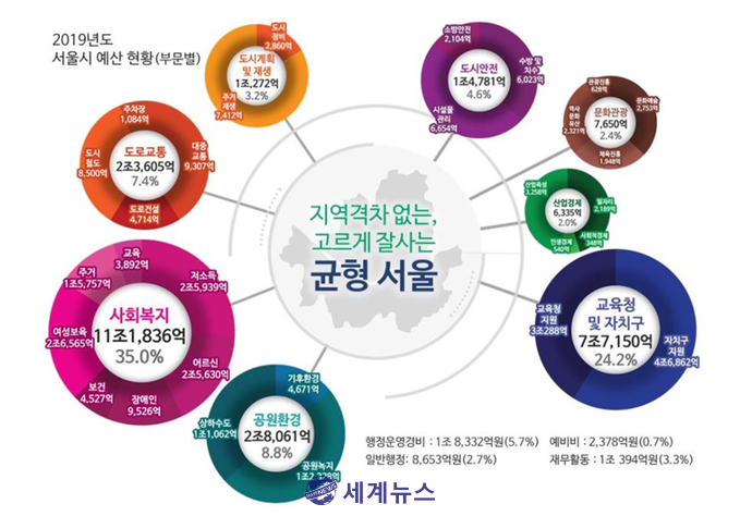 [세계뉴스] 전승원 기자 = 서울시가 2019년 예산(안) 35조 7,843억 원을 편성하고 1일 서울시의회에 제출했다. 올해 첫 30조를 돌파한 데 이어 35조를 넘어선 역대 최대규모 예산안이다. 올해보다 12.5%(3조 9,702억 원) 증가해 최근 8년 중 증가폭이 가장 크다.