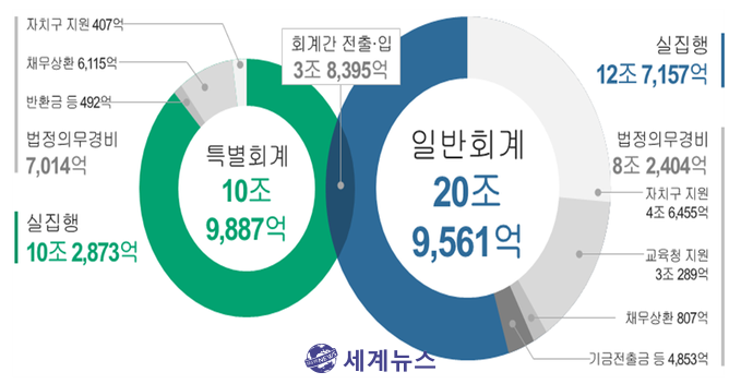 서울시 35조 7,843억 원 중 회계 간 전출입금으로 중복 계상된 부분(3조 8,395억 원)을 제외한 순계예산 규모는 31조 9,448억 원이며, 여기에서 자치구나 교육청 전출 등 법정의무경비(8조 9,418억 원)를 제외하면 실제 집행규모는 23조 30억 원 수준이다.