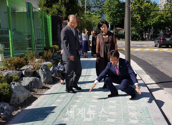 ▲ 서울시의회 환경수자원위원회 김광수 의원(국민의당, 노원5)이 지난 20일 학교관계자와 주민들과 함께 상계중학교 후문 측에 설치되어 있는 보도 확장된 현장을 시찰하고 있다. © 세계뉴스 |