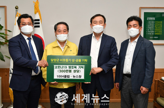 [세계뉴스 한차수 기자] 담양군은 1004클럽 담양군지부(지회장 이병노)와 뉴스창(보도국장 강지훈)에서 지난 10일 300만원 상당의 방호복 300여벌을 기증했다고 밝혔다.