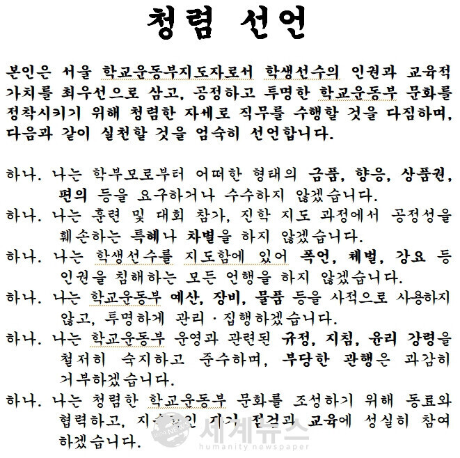 [세계뉴스 = 조홍식 기자] 서울시교육청이 학생선수의 공정한 성장과 학교운동부의 투명한 운영을 위한 제도 개선에 본격적으로 나선다. 정근식 교육감은 오는 15일 이화여자외국어고등학교 유관순기념관에서 '서울 학교운동부 청렴 선포식'을 개최한다고 밝혔다.