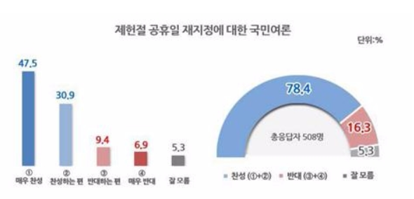 여론조사기관 리얼미터가 제헌절인 17일 CBS ‘김현정의 뉴스쇼’ 의뢰로 제헌절 공휴일 재지정에 대한 국민여론을 조사한 결과 재지정에 찬성한다(매우 찬성 47.5%, 찬성하는 편 30.9%)는 의견이 78.4%로 압도적인 우세를 보인반면 ‘반대한다(매우 반대 6.9%, 반대하는 편 9.4%)’는 의견은 16.3%에 그쳤다.