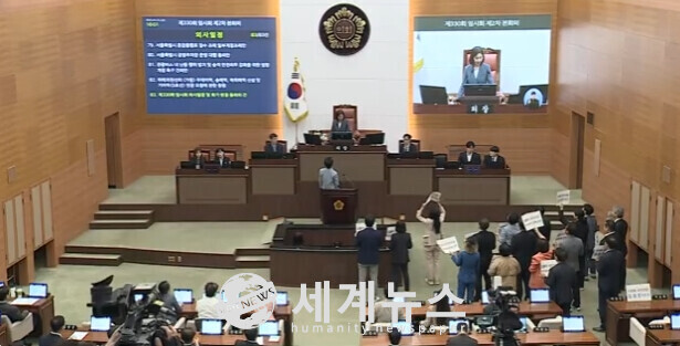 [세계뉴스 = 정서영 기자] 더불어민주당 소속 서울시의회 의원들이 최근 본회의에서 102건의 안건 처리를 앞두고 집단 소란과 난동을 벌여 논란이 일고 있다. 본회의 시작부터 끝까지 이어진 소란은 특히 성흠제 대표의 의장석 난입과 의사봉 탈취로 절정에 달했다.