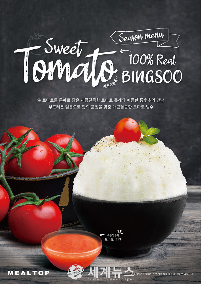 밀탑이 새롭게 출시하는 ‘토마토 빙수’는 부드럽게 갈아낸 얼음과 밀탑 시크릿 레시피로 완성한 밀크 시럽 그리고 별도 제공되는 생 토마토 퓨레를 얼음 위에 올려먹는 빙수이다.