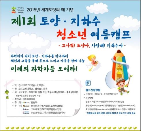 [세종=세계뉴스] 오영규 기자 = 환경부(장관 윤성규)와 한국환경산업기술원(원장 김용주)이 오는 27일부터 29일까지 3일간 서울 안암동 고려대학교에서 초등·중학생 40명을 대상으로 토양·지하수 청소년 여름캠프인 ‘고마워! 토양아, 사랑해! 지하수야’를 개최한다.