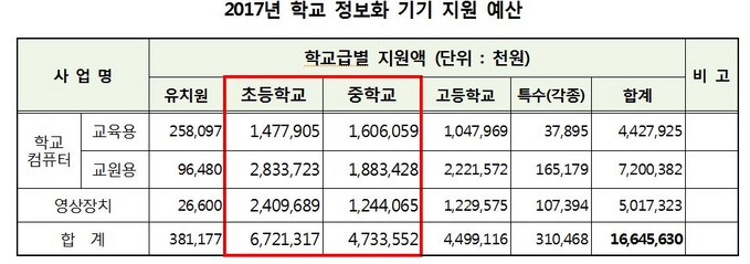 이에 따른 서울시 교육청의 2017년 학교 정보화 기기 예산은 총 166억으로 중학교 교육용 PC 예산은 16억, 초등학교는 14억이다. 교원용 PC 예산은 이보다 많은 중학교 18억, 초등학교 28억이다.