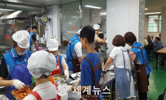 이날 해우리 봉사단은 경로식당을 이용하는 어르신들 약 350명을 대상으로 점심 식사 준비와 배식 지원, 급식소 청소 등 식사부터 마무리 까지 봉사활동을 펼쳤다.