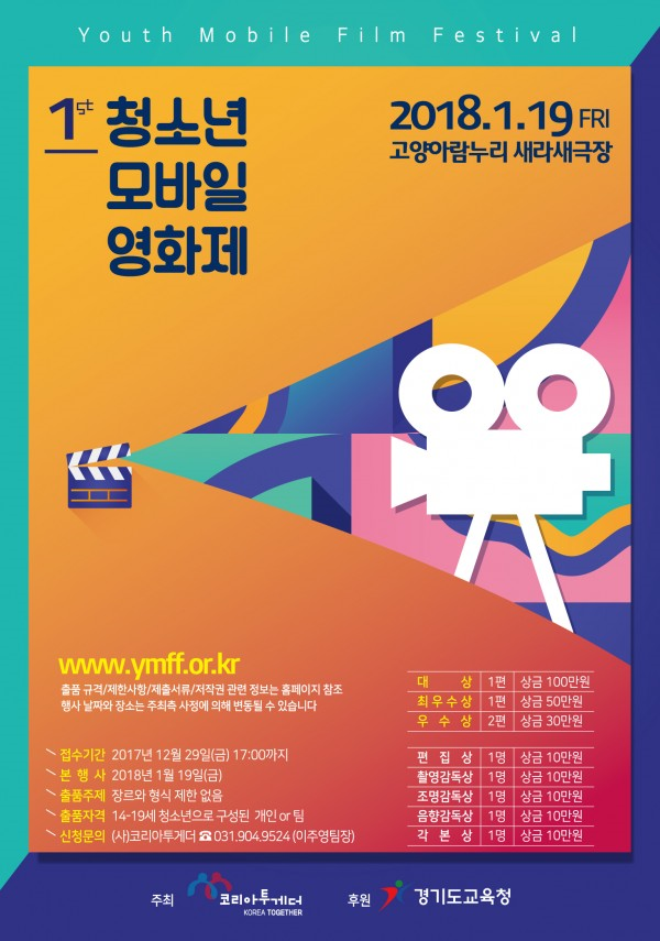 [세계뉴스] 윤소라 기자 = 사단법인 코리아 투게더가 주관하고 경기도 교육청이 후원하는 ‘제1회 청소년 모바일 영화제’가 개최된다.