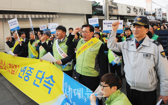 ▲ 동대문구가 지난 3월부터 민‧관‧경 합동 단속반을 편성한 가운데 유덕열(오른쪽 2번째) 구청장과 관계자들이 학교주변 유해업소를 대상으로 청소년보호 캠페인을 벌이고 있다. © 세계뉴스 |
