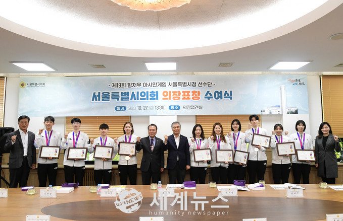 [세계뉴스 윤소라 기자] 김현기 서울특별시의회 의장은 27일 제19회 항저우 아시안게임에서 뛰어난 성적을 거둔 서울시 직장운동경기부 선수 12명에게 의장 표창을 수여했다.