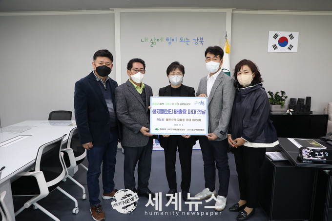 [세계뉴스 김형수 기자] 서울 강북구(구청장 이순희)가 버려지는 폐현수막을 마대로 재활용해 봉제협회에게 지원한다. 탄소중립 실천과 소상공인 지원 두 마리 토끼를 잡겠다는 전략이다.