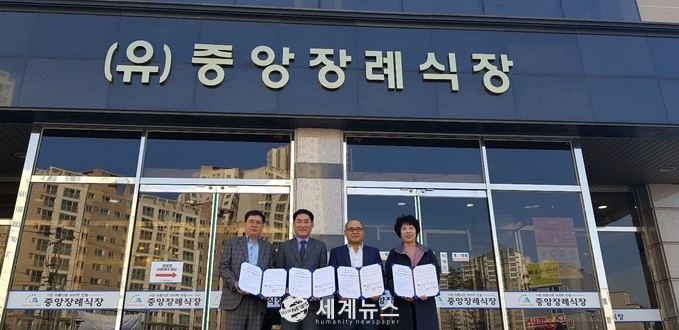 [세계뉴스 윤준필 기자] 저소득층의 장례비 부담을 덜어주기 위해 군산중앙장례식장은 수송동 행정복지센터와 MOU를 체결하고 성금을 기부해 주민들의 호응을 얻고 있다.