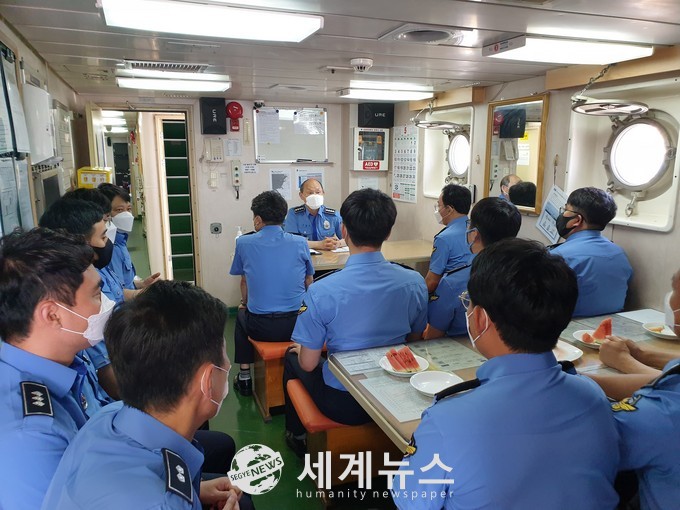 ▲ 부안해양경찰서 김동진 서장이 26일 관내 임해 산업시설을 점검하고 315함을 방문하여 직원들과 소통 간담회를 실시하고 있는 모습. |