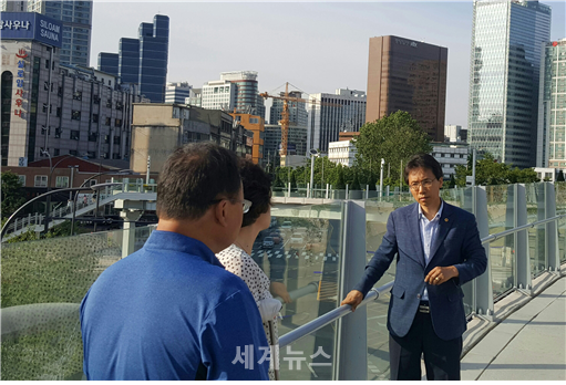 ▲ 김광수(우측) 서울시의원이 30일 오후 '서울로7017' 사고현장을 찾아 서울시 관계자들에게 사고 경위 등을 보고 받으며 안전사고 대책 마련에 고심하고 있다. © 세계뉴스 |