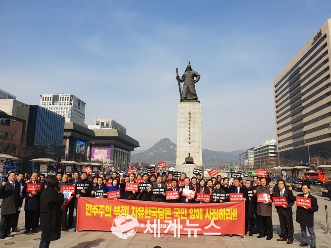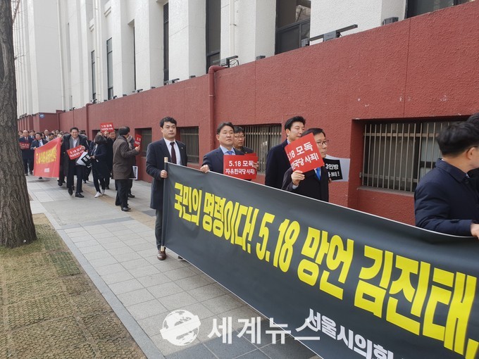 [세계뉴스] 정서영 기자 = 서울시의회 더불어민주당은 어제(21일) 성명에 이어 22일 오후 1시 본관 정문 앞에서 5.18 망언의 자유한국당 3인방을 성토하며 사퇴하라고 촉구했다.