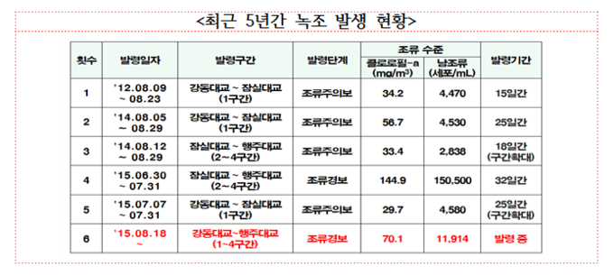 지난 6월 서울에서 조류경보 제도가 시행된 이후 15년 만에 처음으로 조류경보가 발령됐다. 잠실수중보 하류구간(2~4구간)에서는 기준치를 초과한 남조류세포와 클로로필-a가 검출됐다.