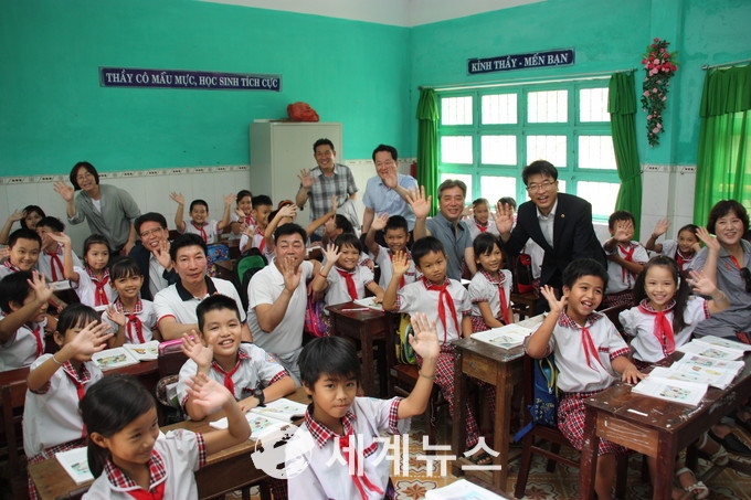 ▲ 판보이 초등학교를 방문한 서울시의회 김용석(우측 정장) 더불어민주당 대표의원이 학생들과 기념촬영을 하고 있다. |
