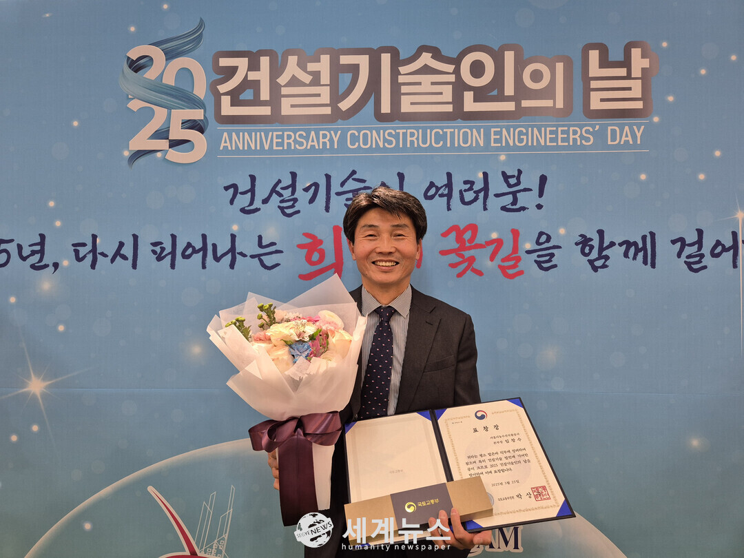 [세계뉴스 = 차성민 기자] 서울시농수산식품공사의 임창수 건설안전본부 이사가 '2025년 건설기술인의 날' 기념식에서 국토교통부장관 표창을 수상했다.