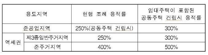 조례안이 시행되면 준공업지역이나 역세권에서 국민임대주택 또는 행복주택을 건립할 경우에도 장기전세주택 건립시에는 조례가 허용하는 용적률 완화혜택을 받을 수 있게 된다.