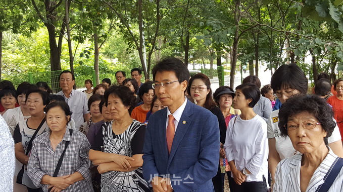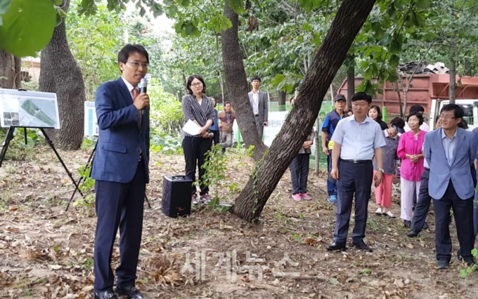 ▲ 서울시의회 환경수자원위원회 소속 김광수 의원(국민의당, 노원5)이 지난 8월 30일 수락산(노원구 상계5동 산149-11번지) 주민설명회에서 공원조성사업에 대해 설명을 하고 있다. 공원조성사업은 서울시예산 5억 38백만원을 투입, 올해 12월 완공된다. © 세계뉴스 |