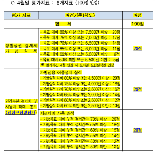 서울시는 300억원을 편성해 각 자치구의 제로페이 가입 실적에 따라 특별교부금을 차등지급한다고 밝힌 바 있으나 평가점수 50점 미만 사업비를 교부대상에서 제외함. (90점이상 20억, 80점 이상 15억, 70점이상 10억, 70점 미만 5억)