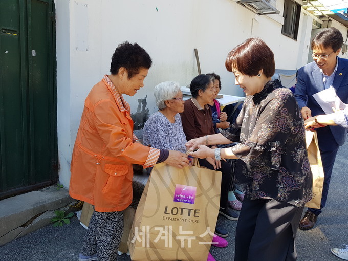 ▲ 롯데백화점 노원점 MVG 사랑나눔봉사단은 추석을 앞두고 서울시의회 김광수 의원(오른쪽)과 함께하는 사랑나눔 봉사를 상계동 지역에 거주하는 51명의 어르신들에게 생필품을 직접 전달했다. © 세계뉴스 |
