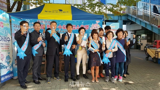 ▲ 15일 노원구 상계동 벽산아파트에서 북부수도사업소 “1일 현장 수도사업소장”으로 위촉 된 김광수 서울시의원(왼쪽 4번째)이 안전하고 깨끗한 아리수를 시민들에게 직접 알리고 있다. © 세계뉴스 |