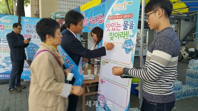 ▲ 15일 노원구 상계동 벽산아파트에서 북부수도사업소 “1일 현장 수도사업소장”으로 위촉된 김광수 서울시의원(가운데)이 음용시음 후 스티커를 붙이고 있다. © 세계뉴스 |