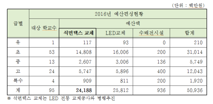 ▲ 2016년도 예산안 중 석면제거사업 편성현황 (서울시교육청) © 세계뉴스 |