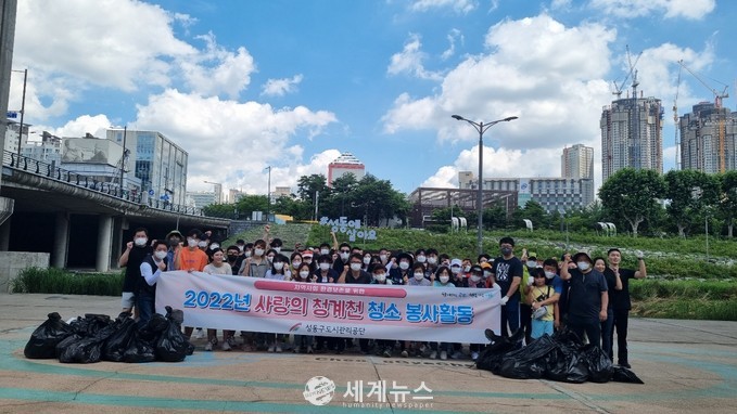 [세계뉴스 조홍식 기자] 성동구(구청장 정원오) 산하 성동구도시관리공단(이사장 김종선, 이하 ‘공단’)은 2일, 장마철 하천변 정화를 위해 지역 주민과 함께 청계천 산책로 일대 청소 봉사활동을 실시했다고 밝혔다.
