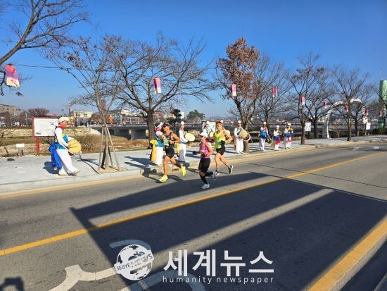 ▲ "남원춘향풍물놀이패" 마라토너들의 힘 북돋아주는 장면 |