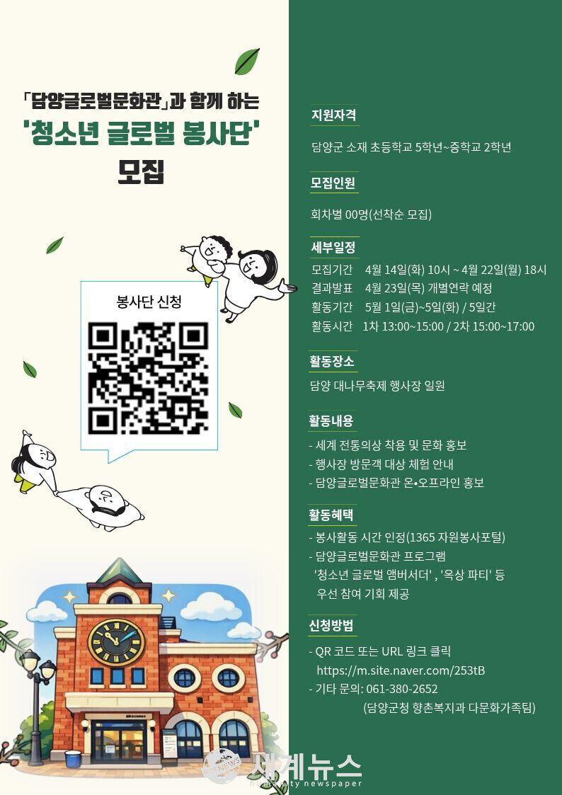 [세계뉴스 = 양경희 기자] 담양군이 담양 대나무 축제 기간 담양글로벌문화관 홍보와 다문화 체험 활동 부스를 함께 운영할 ‘청소년 글로벌 봉사단’을 모집한다.