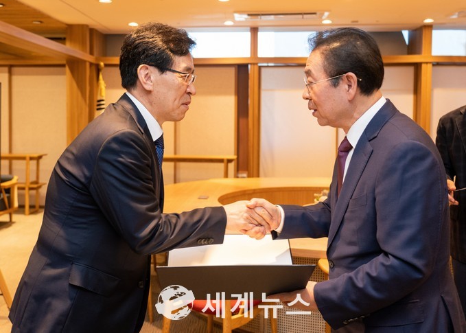 ▲ 지난 4일 조성일(왼쪽) 서울시설공단 신임 이사장이 서울특별시청 시장실에서 박원순(오른쪽) 서울시장으로부터 임명장을 수여받고 있다. |