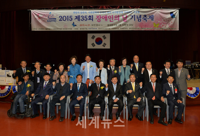 ▲ 21일 동대문구청에서 열린 ‘제35회 동대문구 장애인의 날 기념축제’ 행사에서 강병호 동대문부구청장(앞줄 오른쪽 네번째)이 내외귀빈들과 기념촬영을 하고 있다. © 세계뉴스 |