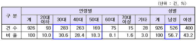 피해신고자는 남성이 56.7%로 여성에 비해 다소 높았고, 경제활동 연령대인 30대~50대가 대부분(77.3%)이었다.