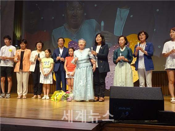 ▲ 12일 서울시청 8층 다목적홀에서 개최된 서울시 일본군 위안부피해자 평화콘서트 ‘나비’에 박원순 시장(왼쪽 5번째)과 이순자 위원장(오른쪽 2번째)이 참석해 할머니들을 위로하는 자리를 가졌다. © 세계뉴스 |