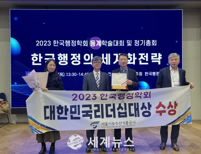 [세계뉴스 차성민 기자] 서울특별시농수산식품공사(사장 문영표, 이하 ‘공사’)는 한국행정학회에서 지방공공기관을 대상으로 수여하는 ‘2023 대한민국리더십대상’에서 섬김 리더십 분야 수상기관에 선정됐다.