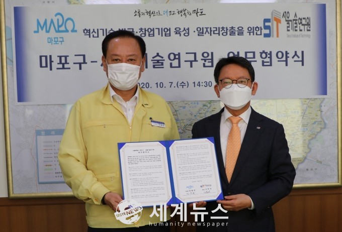 [세계뉴스 차성민 기자] 서울기술연구원(원장 고인석)은 마포구(구청장 유동균)와 7일 마포구청에서 혁신기술 실증을 위한 혁신실증지구 및 마포구 창업기업 기술사업화 지원을 위한 협력 MOU를 체결했다.